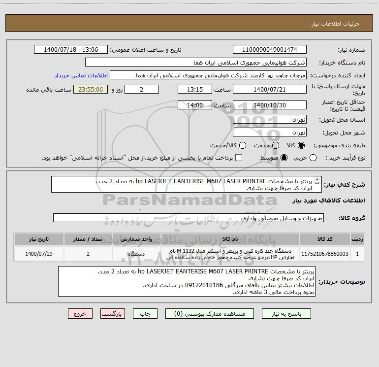 شرح کلی نیاز: پرینتر با مشخصات hp LASERJET EANTERISE M607 LASER PRINTRE به تعداد 2 عدد.