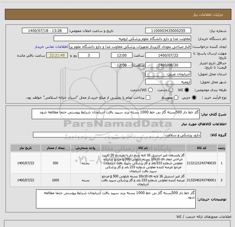شرح کلی نیاز: گاز خط دار 500بسته گاز بی خط 1000 بسته برند سپید بافت آذربایجان شرایط پیوستی حتما مطالعه شود