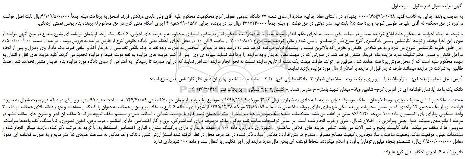 به موجب پرونده اجرایی به کلاسه(قدیم ۹۹۰۱۰۲۸)(0000945 جدید) و در راستای مفاد اجراییه صادره از سوی شعبه ۲۳ دادگاه عمومی حقوقی کرج محکومیت محکوم علیه آقای ولی عابدی ورنکش فرزند اسحق به پرداخت مبلغ جمعاً ۴/۱۱۹/۵۰۰/۰۰۰ریال بابت اصل خواسته و غیره در حق محکوم له آقای علیرضا طوسی گلوجه و پرداخت ۵٪ بابت نیم عشر دولتی در حق دولت . و مبلغ جمعاً ۴۳۱۷۲۴۰۰۰۰ ریال نیز در پرونده اجرایی ۹۹۰۱۵۸۷ شعبه ۴ اجرای احکام مدنی کرج در حق محکوم له پرونده بنام یونس نعمتی اردهائی.