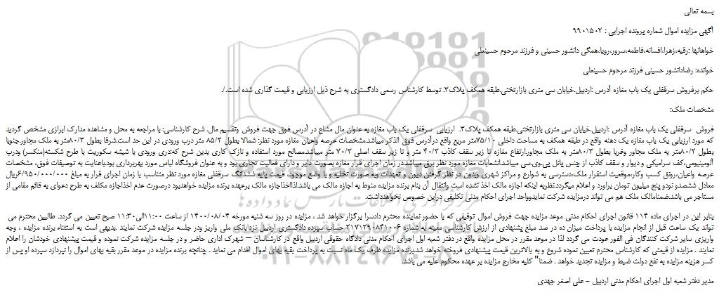 آگهی مزایده اموال شماره پرونده اجرایی : 9901502