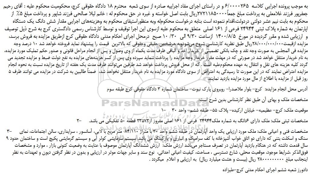 به موجب پرونده اجرایی کلاسه 6/0000265 و در راستای اجرای مفاد اجراییه صادره از سوی شعبه محترم ۱۸ دادگاه حقوقی کرج، محکومیت محکوم علیه : آقای رحیم جعفرپور فرزند غلامعلی به پرداخت مبلغ جمعاً27211850000ریال بابت اصل خواسته و غیره در حق محکوم له : خانم لیلا صالحی فرزند شاپور و پرداخت مبلغ 5% از محکوم به بابت نیم عشر دولتی دردولت،اقدام ننموده است بنابه درخواست محکوم له وبه منظوراستیفای محکوم به وهزینه های اجرایی مقدار شش دانگ یک دستگاه اپارتمان به شماره پلاک ثبتی 24944 فرعی از 161 اصلی متعلق به محکوم علیه ازسوی این اجرا توقیف و توسط کارشناس رسمی دادگستری کرج به شرح ذیل توصیف و ارزیابی شده و مقرر گردیده در مورخ 1400/8/5 ازساعت 9/30 الی 30/ 10 صبح درمحل اجرای احکام مدنی دادگاه حقوقی کرج ازطریق مزایده به فروش برسد، مزایده ازقیمت28/000/000/000ریال طبق نظریه کارشناسی شروع می شودوبه هرشخص حقیقی وحقوقی که بالاترین قیمت را پیشنهاد نماید فروخته خواهد شد ۱۰ درصد وجه مزایده فی المجلس به صورت وجه نقد و چک بانکی تضمینی از خریدار اخذ و الباقی ظرف مدت یکماه از وی وصول و پس از انجام مراحل قانونی و صدور حکم تملیک مورد مزایده، به نام خریدار منتقل خواهد شد در صورتی که در مهلت مقرر خریدار وجه مزایده را پرداخت ننماید سپرده وی پس از کسر هزینه های مزایده به نفع دولت ضبط و مزایده تجدید می گردد کلیه هزینه های نقل و انتقال به عهده محکوم علیه است . که از محل فروش پرداخت خواهد شد طرفین می توانند ظرف مدت یک هفته از تاریخ مزایده نسبت به نحوه انجام مزایده اعتراض نمایند که در این صورت تا رسیدگی به اعتراض از سوی دادگاه مورد مزایده به نام خریدار منتقل نخواهد شد، ضمناً طالبین به شرکت در مزایده می توانند ظرف ۵ روز قبل از مزایده با اطلاع از مال مورد مزایده بازدید نمایند.