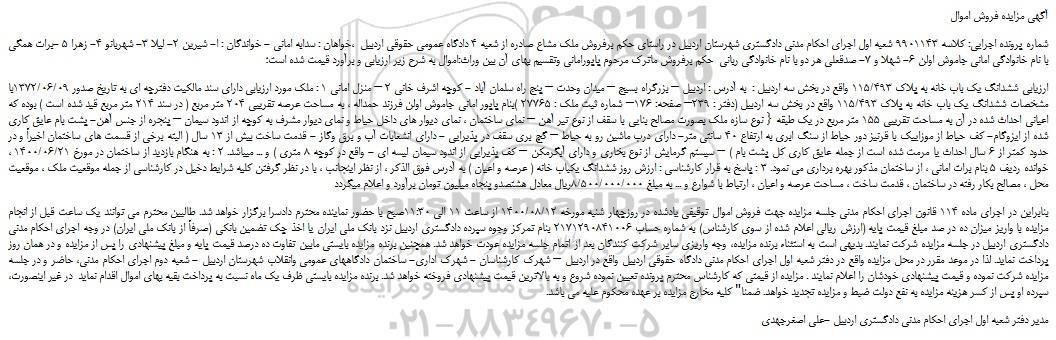 شماره پرونده اجرایی: کلاسه 9901143 شعبه اول اجرای احکام مدنی دادگستری شهرستان اردبیل در راستای حکم برفروش ملک مشاع صادره از شعبه 4 دادگاه عمومی حقوقی اردبیل ،خواهان : سدابه امانی - خواندگان : ا- شیرین 2- لیلا 3- شهربانو 4- زهرا 5 -برات همگی با نام خانوادگی امانی جاموش اولن 6- شهلا و 7- صدقعلی هر دو با نام خانوادگی ربانی حکم برفروش ماترک مرحوم پاپورامانی وتقسیم بهای آن بین وراث:اموال به شرح زیر ارزیابی و برآورد قیمت شده است؛