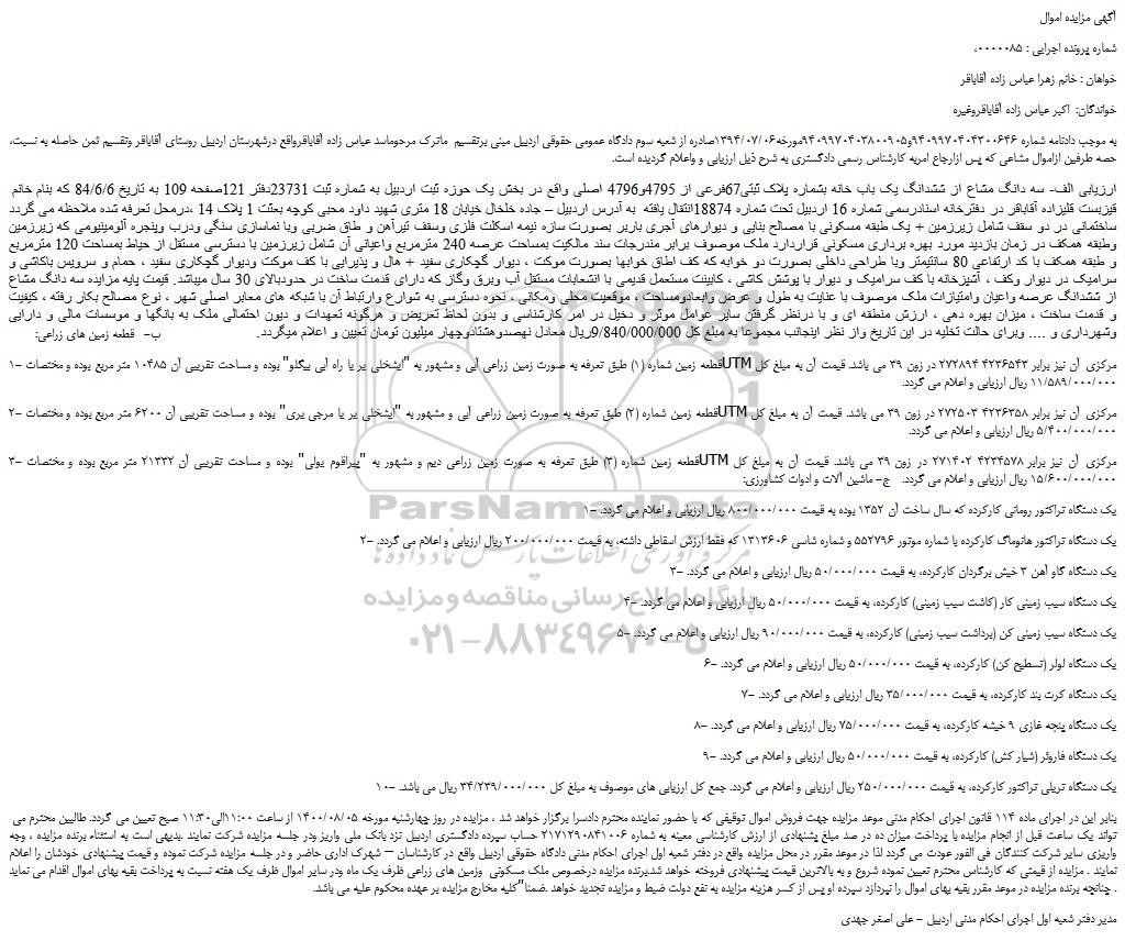 ،به موجب دادنامه شماره 9409970404300646و9409970403800905مورخه1394/07/06صادره از شعبه سوم دادگاه عمومی حقوقی اردبیل مبنی برتقسیم ماترک مرحوماسد عباس زاده آقاباقرواقع درشهرستان اردبیل روستای آقاباقر وتقسیم ثمن حاصله به نسبت حصه طرفین ازاموال مشاعی که پس ازارجاع امربه کارشناس رسمی دادگستری به شرح ذیل ارزیابی و واعلام گردیده است.