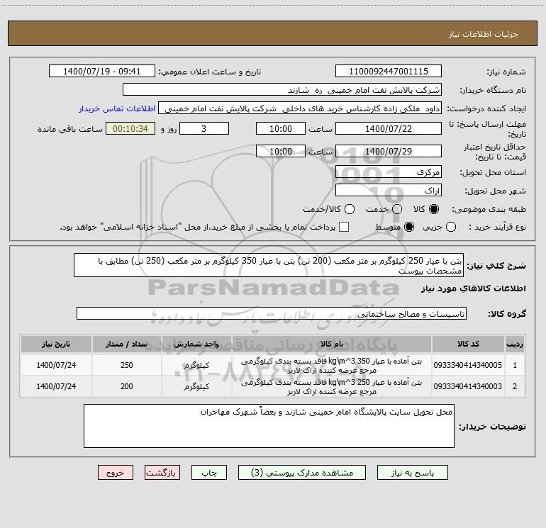 شرح کلی نیاز: بتن با عیار 250 کیلوگرم بر متر مکعب (200 تن) بتن با عیار 350 کیلوگرم بر متر مکعب (250 تن) مطابق با مشخصات پیوست