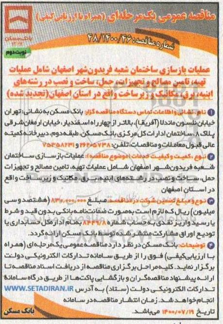 عملیات بازسازی ساختمان شعبه فریدون شهر اصفهان مشتمل بر عملیات تهیه، تامین مصالح و تجهیزات،ساخت و نصب در رشته های ابنیه، برق، مکانیک و زیرساخت واقع در استان اصفهان