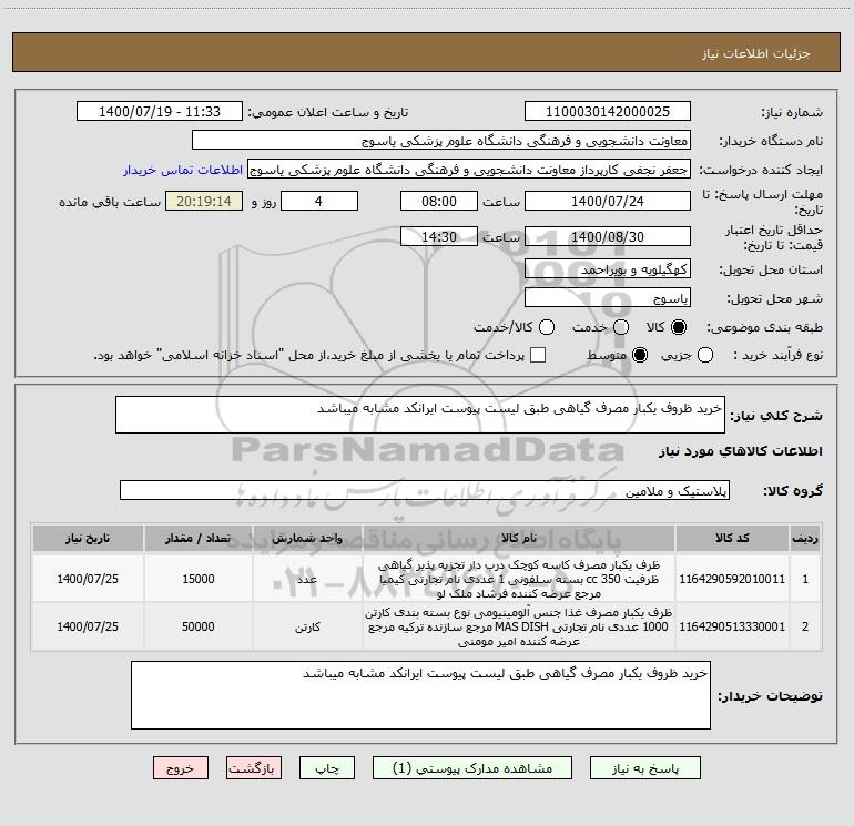 شرح کلی نیاز: خرید ظروف یکبار مصرف گیاهی طبق لیست پیوست ایرانکد مشابه میباشد