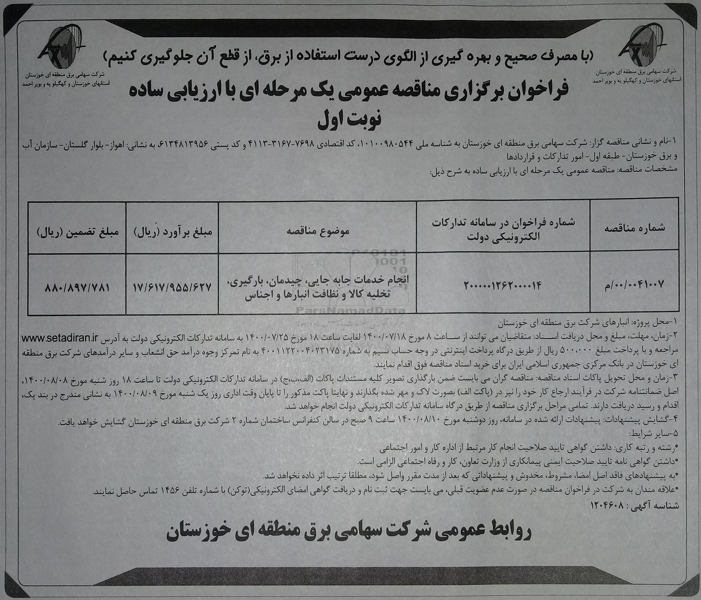م/00/0041007 2000001262000014 انجام خدمات جابه جایی، چیدمان، بارگیری، تخلیه کالا و نظافت انبارها و اجناس
