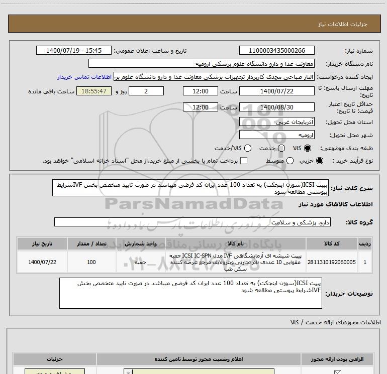شرح کلی نیاز: پیپت ICSI(سوزن اینجکت) به تعداد 100 عدد ایران کد فرضی میباشد در صورت تایید متخصص بخش IVFشرایط پیوستی مطالعه شود