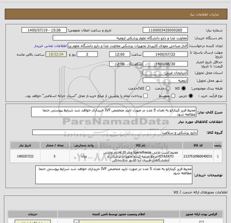 شرح کلی نیاز: محیط فریز کیتازاتو به تعداد 5 عدد در صورت تایید متخصص IVF خریداری خواهد شد شرایط پیوستی حتما مطالعه شود