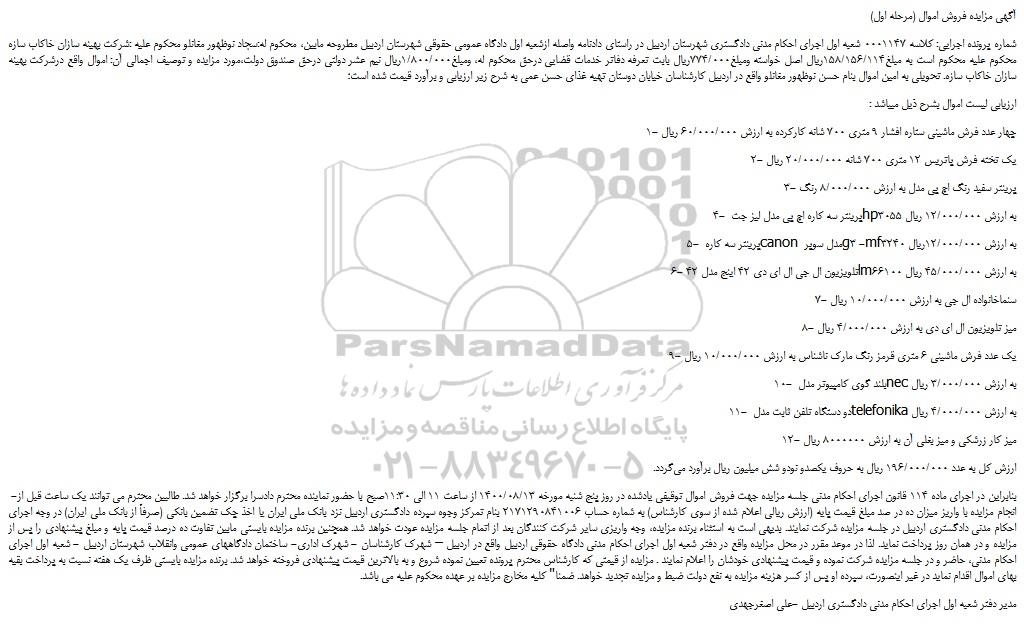 شماره پرونده اجرایی: کلاسه 0001147 شعبه اول اجرای احکام مدنی دادگستری شهرستان اردبیل در راستای دادنامه واصله ازشعبه اول دادگاه عمومی حقوقی شهرستان اردبیل مطروحه مابین، محکوم له:سجاد نوظهور مغانلو محکوم علیه :شرکت بهینه سازان خاکاب سازه محکوم علیه محکوم است به مبلغ158/156/114ریال اصل خواسته ومبلغ774/000ریال بابت تعرفه دفاتر خدمات قضایی درحق محکوم له، ومبلغ1/800/000ریال نیم عشر دولتی درحق صندوق دولت،مورد مزایده و توصیف اجمالی آن: اموال واقع درشرکت بهینه سازان خاکاب سازه. تحویلی به امین اموال بنام حسن نوظهور مغانلو واقع در اردبیل کارشناسان خیابان دوستان تهیه غذای حسن عمی به شرح زیر ارزیابی و برآورد قیمت شده است؛