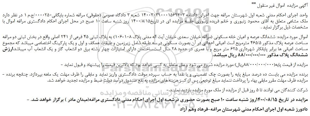 اموال مورد مزایده: ششدانگ عرصه و اعیان خانه مسکونی (مراغه خیابان سعدی خیابان آیت اله مدنی پلاک 108-106) به پلاک ثبتی 45 فرعی از 241 اصلی واقع در بخش ثبتی دو مراغه مساحت عرصه پلاک مذکور 465/5 مترمربع است اعیانی احداثی در آن بصورت مسکونی در سه طبقه شامل زیرزمین و طبقات همکف و اول و یک پارکینگ اختصاصی میباشد که مجموع مساحت اعیانی ها برابر پایانکار شهرداری 625 متر مربع و با عمری در حدود 28 سال است.ساختمان دارای امتیازات چهار رشته برق دو انشعاب گاز و یک انشعاب آب میباشد.ارزش ششدانگ پلاک مذکور 88/000/000/000 ریال میباشد.