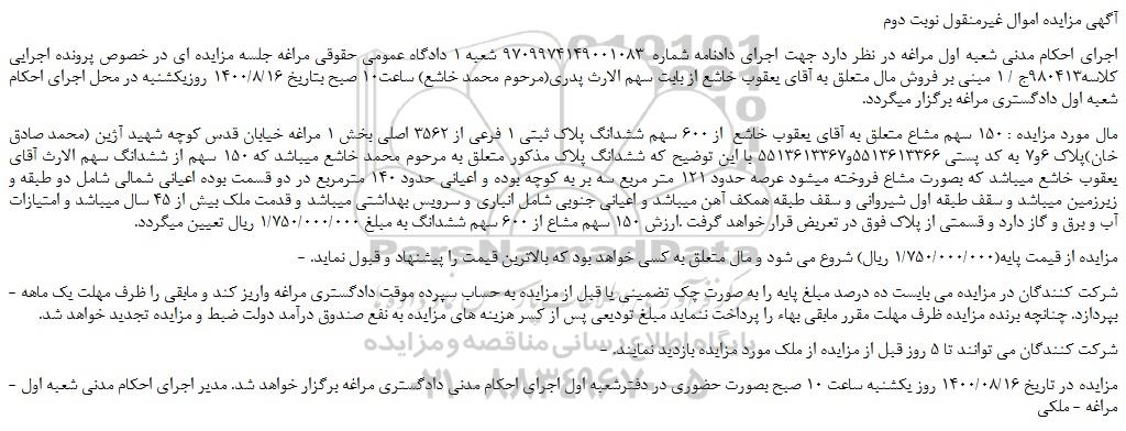 مزایده فروش 150 سهم مشاع از 600 سهم ششدانگ پلاک ثبتی 1 فرعی از 3562 اصلی, مزایده،مزایده فروش 150 سهم مشاع از 600 سهم ششدانگ پلاک ثبتی 1 فرعی از 3562 اصلی