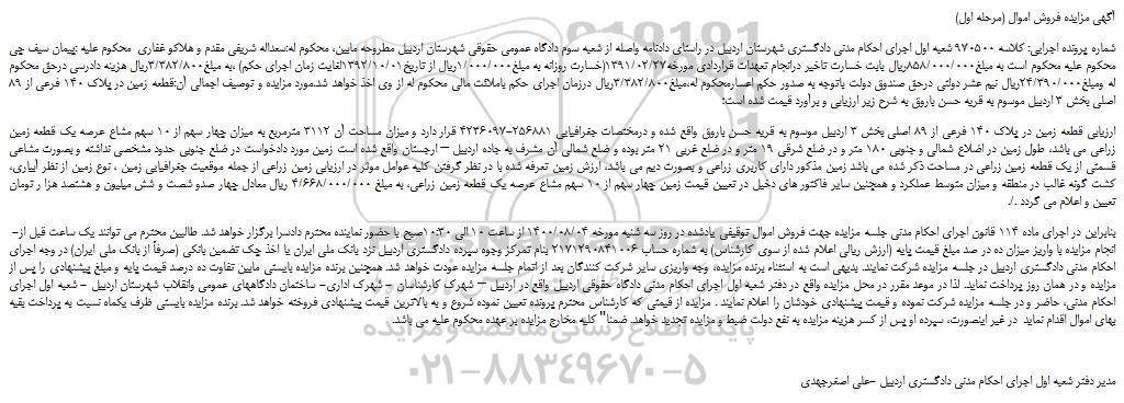 شماره پرونده اجرایی: کلاسه 970500 شعبه اول اجرای احکام مدنی دادگستری شهرستان اردبیل در راستای دادنامه واصله از شعبه سوم دادگاه عمومی حقوقی شهرستان اردبیل مطروحه مابین، محکوم له:سعداله شریفی مقدم و هلاکو غفاری محکوم علیه :پیمان سیف چی محکوم علیه محکوم است به مبلغ858/000/000ریال بابت خسارت تاخیر درانجام تعهدات قراردادی مورخه1391/02/27(خسارت روزانه به مبلغ1/000/000ریال از تاریخ1392/10/01لغایت زمان اجرای حکم) ،به مبلغ3/382/800ریال هزینه دادرسی درحق محکوم له ومبلغ24/390/000ریال نیم عشر دولتی درحق صندوق دولت باتوجه به صدور حکم اعسارمحکوم له،مبلغ3/382/800ریال درزمان اجرای حکم باملائت مالی محکوم له از وی اخذ خواهد شد.مورد مزایده و توصیف اجمالی آن:قطعه زمین در پلاک 140 فرعی از 89 اصلی بخش 3 اردبیل موسوم به قریه حسن باروق به شرح زیر ارزیابی و برآورد قیمت شده است؛