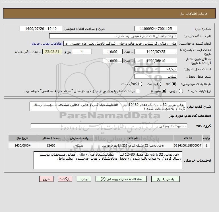 شرح کلی نیاز: روغن توربین 32 با پایه یک مقدار 12480 لیتر /لطفاپیشنهاد فنی و مالی مطابق مشخصات پیوست ارسال گردد / به صورت پالت شده /