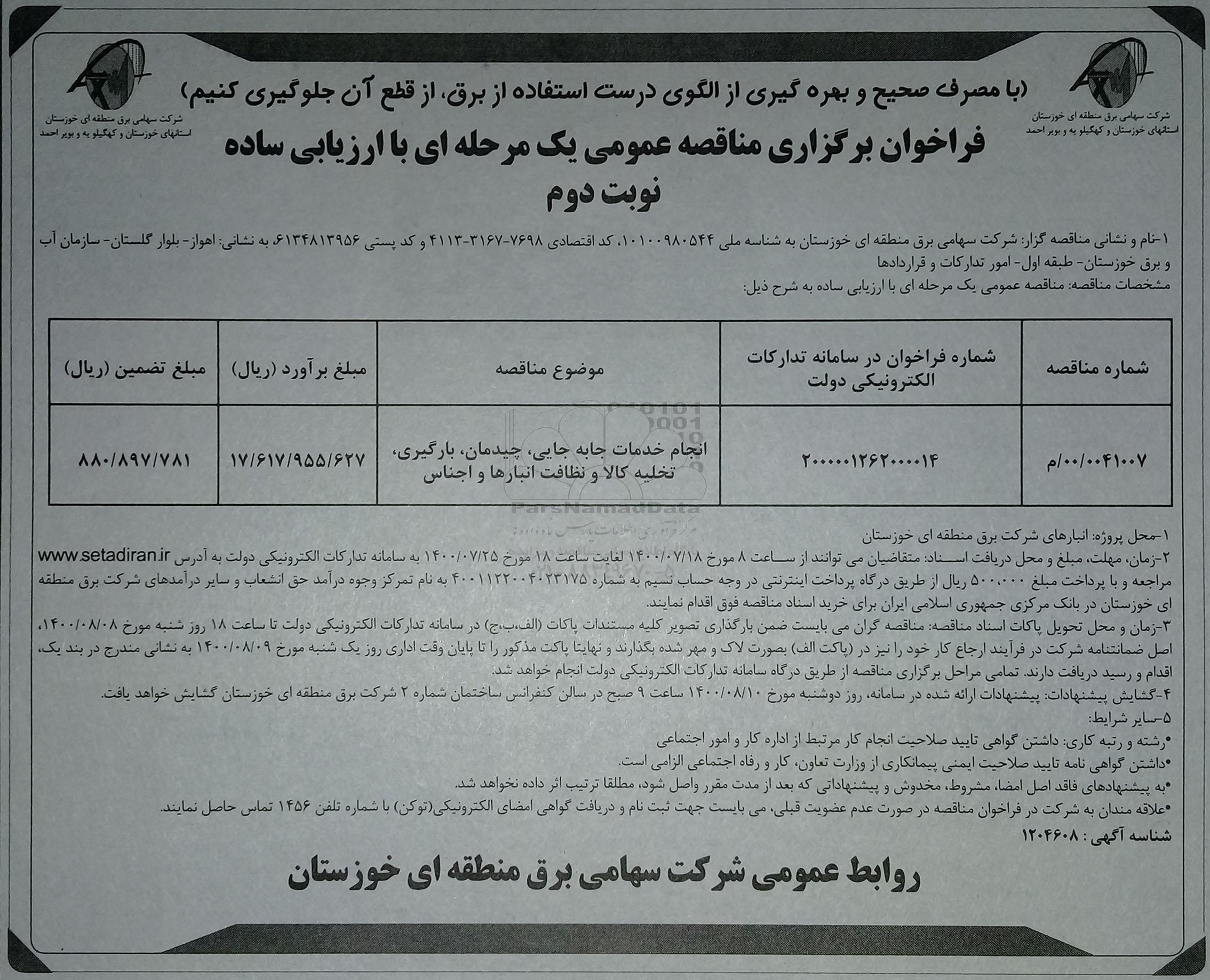 م/00/0041007 2000001262000014 انجام خدمات جابه جایی، چیدمان، بارگیری، تخلیه کالا و نظافت انبارها و اجناس