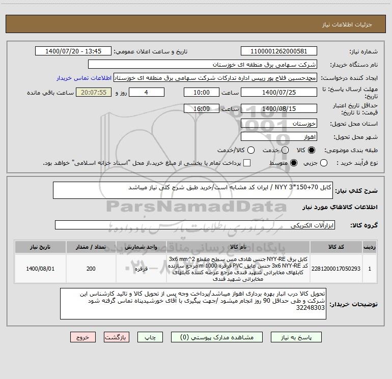 شرح کلی نیاز: کابل NYY 3*150+70 / ایران کد مشابه است/خرید طبق شرح کلی نیاز میباشد