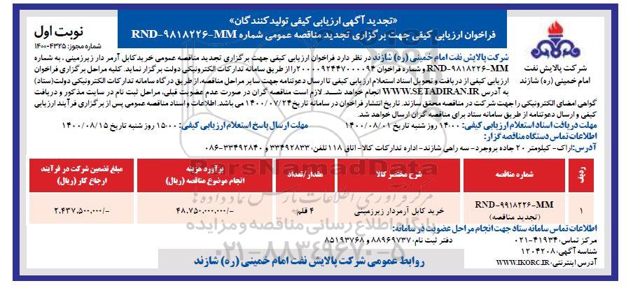 شرکت پالایش نفت امام خمینی (ره) شازند در نظر دارد خرید کابل آرمردار زیرزمینی به شماره RND 9818226-MM و شماره فراخوان 2000092447000094 را از طریق سامانه تدارکات الکترونیکی دولت برگزار نماید. کلیه مراحل برگزاری فراخوان ارزیابی کیفی از دریافت و تحویل اسناد استعلام ارزیابی کیفی تا ارسال دعوتنامه جهت سایر مراحل مناقصه از طریق درگاه سامانه تدارکات الکترونیکی دولت ستاد انجام خواهد شد لازم است مناقصه گران در صورت عدم عضویت قبلی مراحل ثبت نام در سایت مذکور و دریافت گواهی امضای الکترونیکی را جهت شرکت در مناقصه محقق سازند . تاریخ انتشار فراخوان در سامانه تاریخ 1400.7.24 می باشد