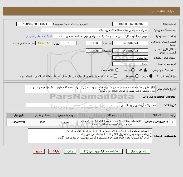 شرح کلی نیاز: الکل طبق مشخصات مندرج در فرم پیشنهاد قیمت پیوست ( پیشنهاد دهندگان ملزم به تکیمل فرم پیشنهاد می باشند درغیراینصورت مردود اعلام می گردد)