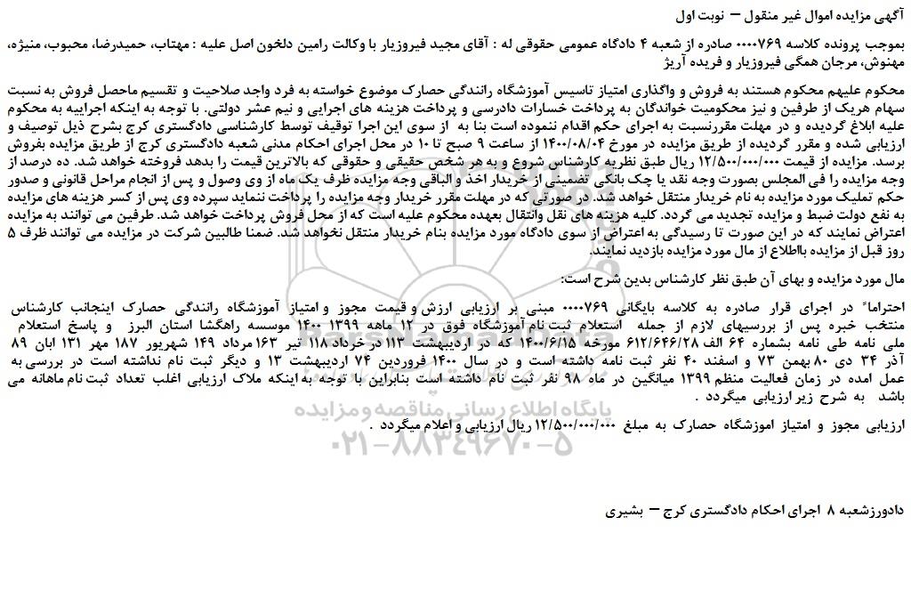 محکوم علیهم محکوم هستند به فروش و واگذاری امتیاز تاسیس آموزشگاه رانندگی حصارک موضوع خواسته به فرد واجد صلاحیت و تقسیم ماحصل فروش به نسبت سهام هریک از طرفین و نیز محکومیت خواندگان به پرداخت خسارات دادرسی و پرداخت هزینه های اجرایی و نیم عشر دولتی. با توجه به اینکه اجراییه به محکوم علیه ابلاغ گردیده و در مهلت مقررنسبت به اجرای حکم اقدام ننموده است بنا به از سوی این اجرا توقیف توسط کارشناسی دادگستری کرج بشرح ذیل توصیف و ارزیابی شده و مقرر گردیده از طریق مزایده در مورخ 1400/08/04 از ساعت 9 صبح تا 10 در محل اجرای احکام مدنی شعبه دادگستری کرج از طریق مزایده بفروش برسد. مزایده از قیمت 12/500/000/000 ریال طبق نظریه کارشناس شروع و به هر شخص حقیقی و حقوقی که بالاترین قیمت را بدهد فروخته خواهد شد. ده درصد از وجه مزایده را فی المجلس بصورت وجه نقد یا چک بانکی تضمینی از خریدار اخذ و الباقی وجه مزایده ظرف یک ماه از وی وصول و پس از انجام مراحل قانونی و صدور حکم تملیک مورد مزایده به نام خریدار منتقل خواهد شد. در صورتی که در مهلت مقرر خریدار وجه مزایده را پرداخت ننماید سپرده وی پس از کسر هزینه های مزایده به نفع دولت ضبط و مزایده تجدید می گردد. کلیه هزینه های نقل وانتقال بعهده محکوم علیه است که از محل فروش پرداخت خواهد شد. طرفین می توانند به مزایده اعتراض نمایند که در این صورت تا رسیدگی به اعتراض از سوی دادگاه مورد مزایده بنام خریدار منتقل نخواهد شد. ضمنا طالبین شرکت در مزایده می توانند ظرف 5 روز قبل از مزایده بااطلاع از مال مورد مزایده بازدید نمایند.