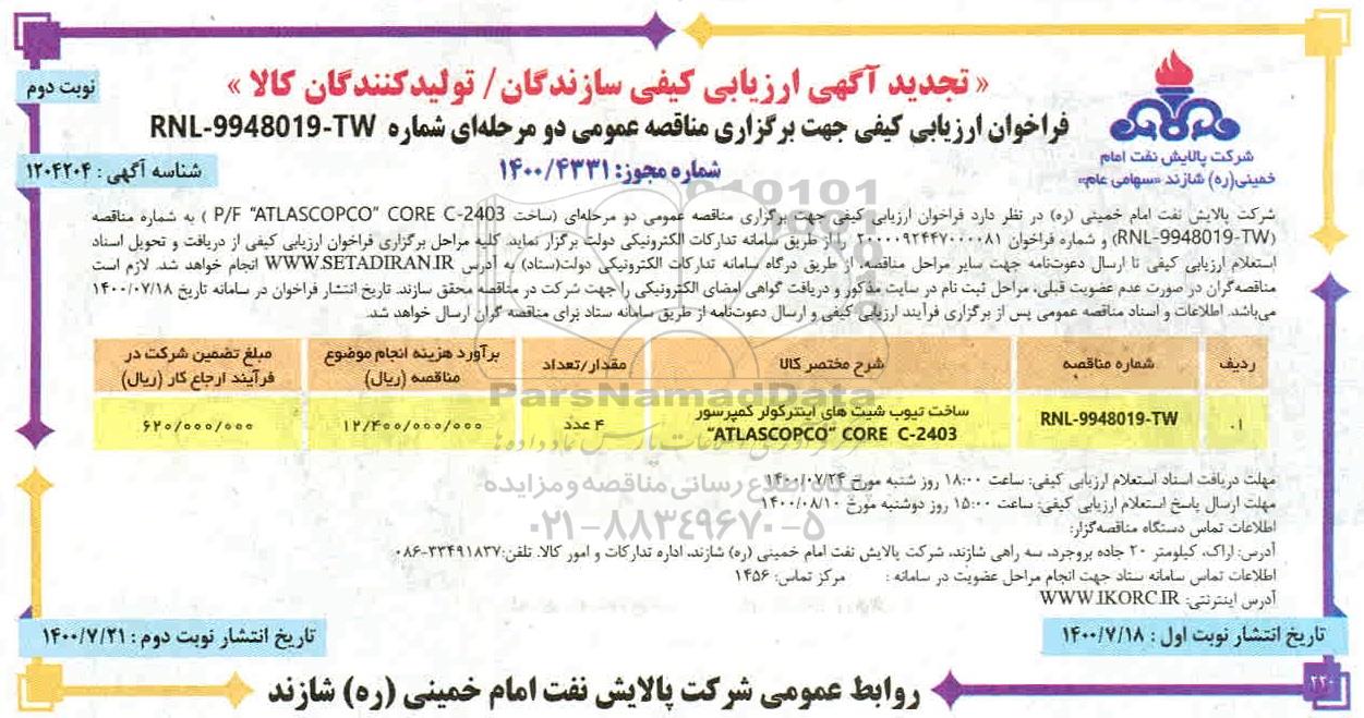 شرکت پالایش نفت امام خمینی (ره) شازند در نظر دارد فراخوان ارزیابی کیفی جهت برگزاری مناقصه عمومی دو مرحله ای (ساخت P/F "ATLASCOPCO" CORE C-2403) به شماره مناقصه RNL - 9948019 - TW و شماره فراخوان 2000092447000081 را از طریق سامانه تدارکات الکترونیکی دولت برگزار نماید. کلیه مراحل برگزاری فراخوان ارزیابی کیفی از دریافت و تحویل اسناد استعلام ارزیابی کیفی تا ارسال دعوتنامه جهت سایر مراحل مناقصه از طریق درگاه سامانه تدارکات الکترونیکی دولت ستاد به آدرس ستاد ایران انجام خواهد شد. لازم است مناقصه گران در صورت عدم عضویت قبلی مراحل ثبت نام در سایت مذکور و دریافت گواهی امضای الکترونیکی را جهت شرکت در مناقصه محقق سازند. تاریخ انتشار فراخوان در سامانه تاریخ 1400.7.18 می باشد. اطلاعات و اسناد مناقصه عمومی پس از برگزاری فرآیند ارزیابی کیفی و ارسال دعوتنامه از طریق سامانه ستاد به مناقصه گران ارسال خواهد شد.