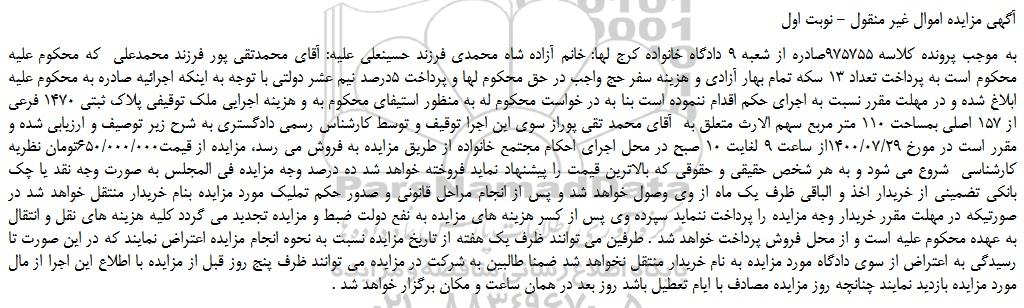 به موجب پرونده کلاسه 975755صادره از شعبه 9 دادگاه خانواده کرج لها: خانم آزاده شاه محمدی فرزند حسینعلی علیه: آقای محمدتقی پور فرزند محمدعلی که محکوم علیه محکوم است به پرداخت تعداد 13 سکه تمام بهار آزادی و هزینه سفر حج واجب در حق محکوم لها و پرداخت 5درصد نیم عشر دولتی با توجه به اینکه اجرائیه صادره به محکوم علیه ابلاغ شده و در مهلت مقرر نسبت به اجرای حکم اقدام ننموده است بنا به در خواست محکوم له به منظور استیفای محکوم به و هزینه اجرایی ملک توقیفی پلاک ثبتی 1470 فرعی از 157 اصلی بمساحت 110 متر مربع سهم الارث متعلق به آقای محمد تقی پوراز سوی این اجرا توقیف و توسط کارشناس رسمی دادگستری به شرح زیر توصیف و ارزیابی شده و مقرر است در مورخ 1400/07/29از ساعت 9 لغایت 10 صبح در محل اجرای احکام مجتمع خانواده از طریق مزایده به فروش می رسد، مزایده از قیمت650/000/000تومان نظریه کارشناسی شروع می شود و به هر شخص حقیقی و حقوقی که بالاترین قیمت را پیشنهاد نماید فروخته خواهد شد ده درصد وجه مزایده فی المجلس به صورت وجه نقد یا چک بانکی تضمینی از خریدار اخذ و الباقی ظرف یک ماه از وی وصول خواهد شد و پس از انجام مراحل قانونی و صدور حکم تملیک مورد مزایده بنام خریدار منتقل خواهد شد در صورتیکه در مهلت مقرر خریدار وجه مزایده را پرداخت ننماید سپرده وی پس از کسر هزینه های مزایده به نفع دولت ضبط و مزایده تجدید می گردد کلیه هزینه های نقل و انتقال به عهده محکوم علیه است و از محل فروش پرداخت خواهد شد . طرفین می توانند ظرف یک هفته از تاریخ مزایده نسبت به نحوه انجام مزایده اعتراض نمایند که در این صورت تا رسیدگی به اعتراض از سوی دادگاه مورد مزایده به نام خریدار منتقل نخواهد شد ضمنا طالبین به شرکت در مزایده می توانند ظرف پنج روز قبل از مزایده با اطلاع این اجرا از مال مورد مزایده بازدید نمایند چنانچه روز مزایده مصادف با ایام تعطیل باشد روز بعد در همان ساعت و مکان برگزار خواهد شد .