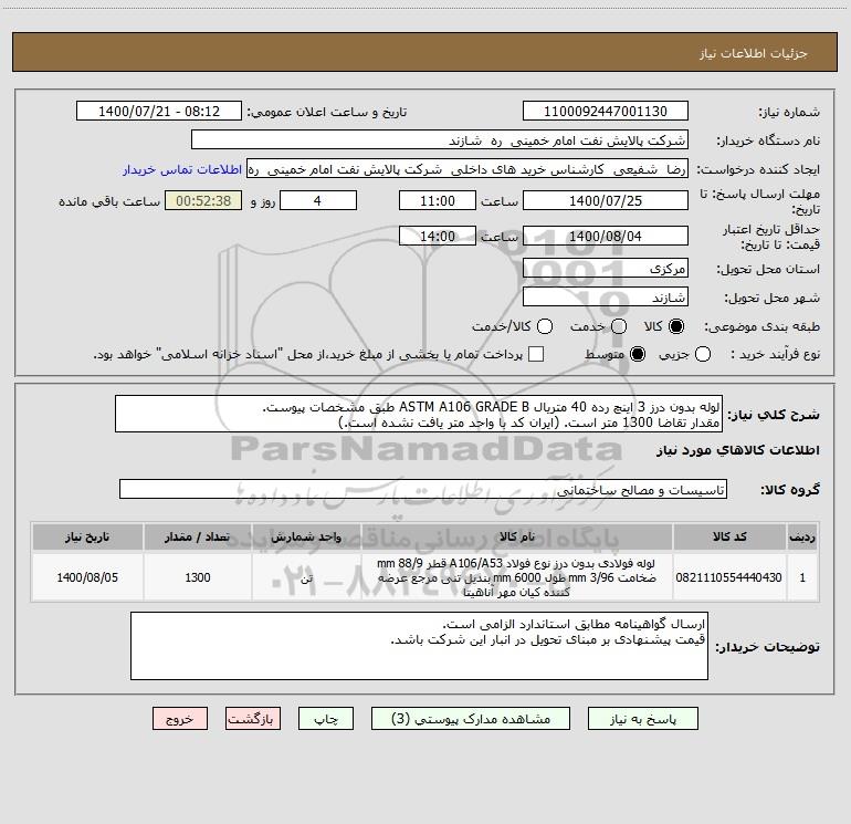 شرح کلی نیاز: لوله بدون درز 3 اینچ رده 40 متریال ASTM A106 GRADE B طبق مشخصات پیوست. مقدار تقاضا 1300 متر است. (ایران کد با واحد متر یافت نشده است.)