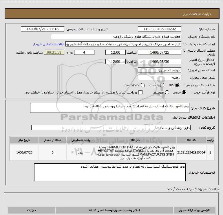 نام دستگاه خریدار:معاونت غذا و دارو دانشگاه علوم پزشکی ارومیه