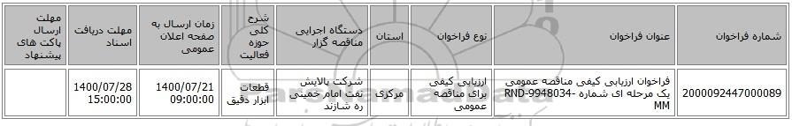 مناقصه، فراخوان ارزیابی کیفی مناقصه عمومی یک مرحله ای شماره RND-9948034-MM از کلیه افراد متخصص و شرکتها واجد شرایط دعوت به عمل میآید در مناقصه با کد خبرگزاری پارس نماد: 3847781 شرکت نمایند.