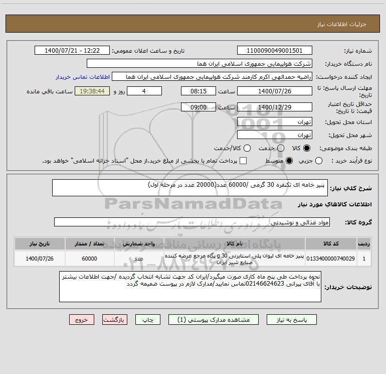 شرح کلی نیاز: پنیر خامه ای تکنفره 30 گرمی /60000 عدد(20000 عدد در مرحله اول)
