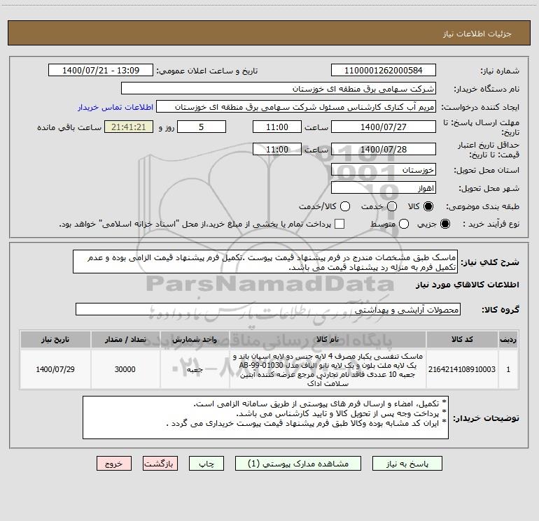 شرح کلی نیاز: ماسک طبق مشخصات مندرج در فرم پیشنهاد قیمت پیوست .تکمیل فرم پیشنهاد قیمت الزامی بوده و عدم تکمیل فرم به منزله رد پیشنهاد قیمت می باشد.