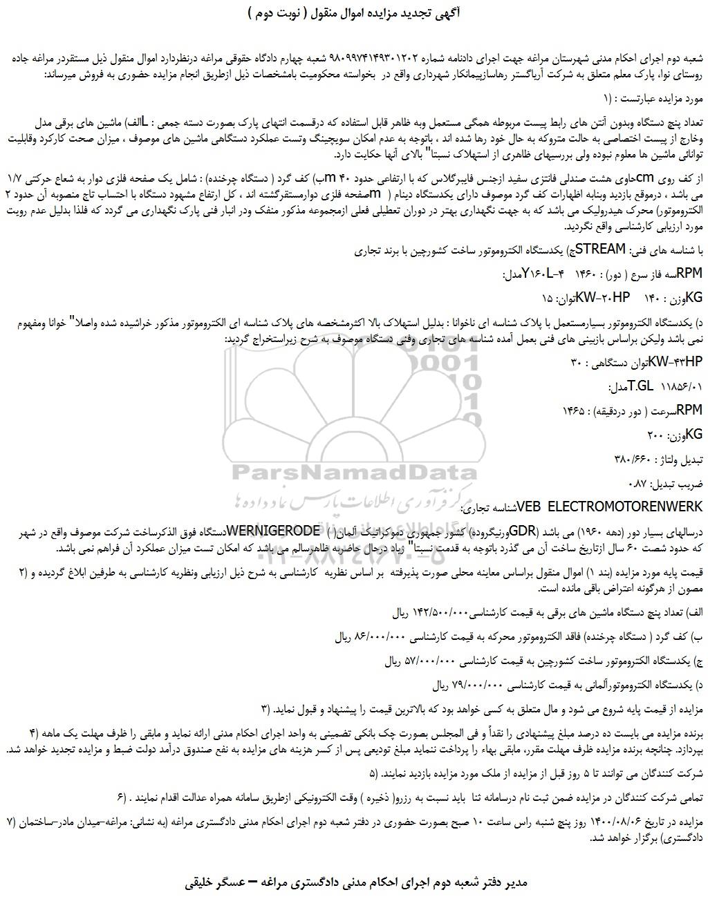 شعبه دوم اجرای احکام مدنی شهرستان مراغه جهت اجرای دادنامه شماره 9809974149301202 شعبه چهارم دادگاه حقوقی مراغه درنظردارد اموال منقول ذیل مستقردر مراغه جاده روستای نوا، پارک معلم متعلق به شرکت آریاگستر رهاسازپیمانکار شهرداری واقع در بخواسته محکومیت بامشخصات ذیل ازطریق انجام مزایده حضوری به فروش میرساند: