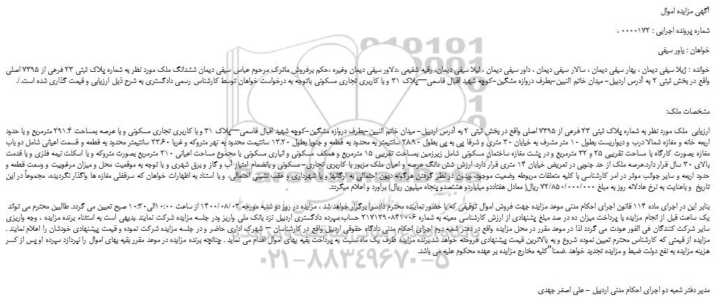 خوانده : ژیلا سیفی دیمان ، بهار سیفی دیمان ، سالار سیفی دیمان ، داور سیفی دیمان ، لیلا سیفی دیمان، رقیه شفیعی ،دلاور سیفی دیمان وغیره ،حکم برفروش ماترک مرحوم عباس سیفی دیمان ششدانگ ملک مورد نظر به شماره پلاک ثبتی 23 فرعی از 7395 اصلی واقع در بخش ثبتی 2 به آدرس اردبیل- میدان خاتم النبین-بطرف دروازه مشگین-کوچه شهید اقبال قاسمی—پلاک 31 و با کاربری تجاری مسکونی باتوجه به درخواست خواهان توسط کارشناس رسمی دادگستری به شرح ذیل ارزیابی و قیمت گذاری شده است./.