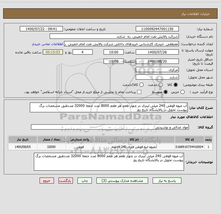 شرح کلی نیاز: آب میوه قوطی 240 میلی لیتری در چهار طعم هر طعم 8000 عدد جمعا 32000 عددطبق مشخصات برگ پیوست تحویل در پالایشگاه تاریخ روز