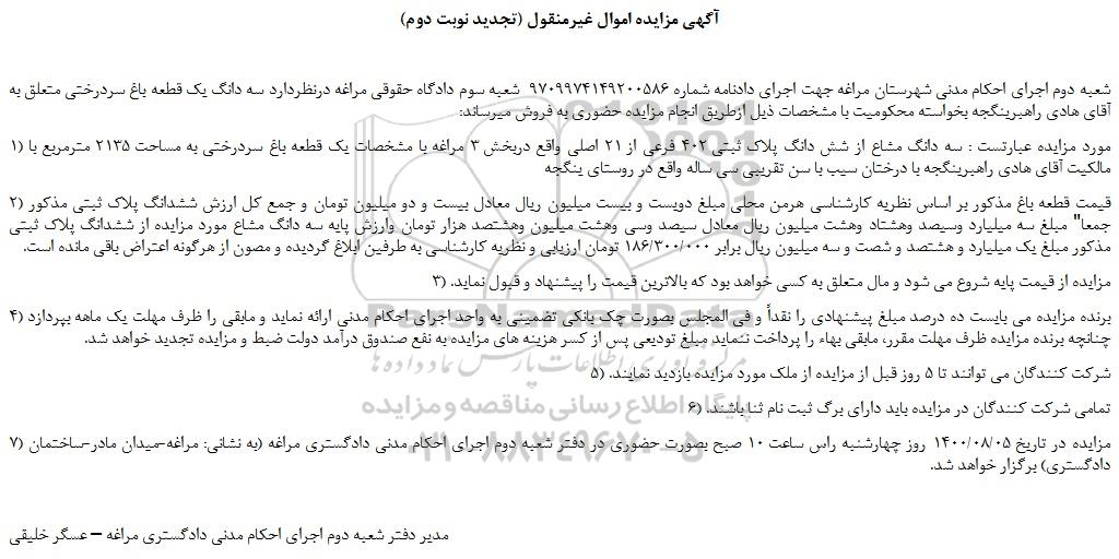 شعبه دوم اجرای احکام مدنی شهرستان مراغه جهت اجرای دادنامه شماره 9709974149200586 شعبه سوم دادگاه حقوقی مراغه درنظردارد سه دانگ یک قطعه باغ سردرختی متعلق به آقای هادی راهبرینگجه بخواسته محکومیت با مشخصات ذیل ازطریق انجام مزایده حضوری به فروش میرساند: