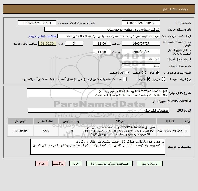 شرح کلی نیاز: کابل NYCYRY 4*10+10 زره دار (مطابق فرم پیوست)