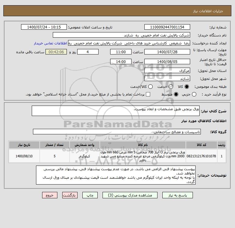 توضیحات خریدار:پیوست پیشنهاد فنی الزامی می باشد. در صورت عدم پیوست پیشنهاد فنی، پیشنهاد مالی بررسی نخواهد شد. با توجه به اینکه واحد ایران کیلوگرم می باشد خواهشمند است قیمت پیشنهادی بر مبنای ورق ارسال گردد.