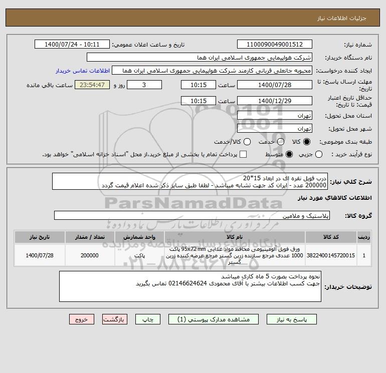 نام دستگاه خریدار:شرکت هواپیمایی جمهوری اسلامی ایران هما