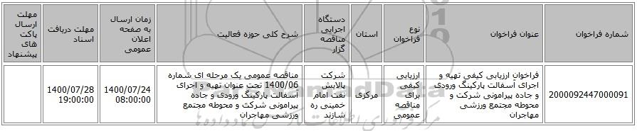| 2000092447000091 | فراخوان ارزیابی کیفی تهیه و اجرای آسفالت پارکینگ ورودی و جاده پیرامونی شرکت و محوطه مجتمع ورزشی مهاجران | ارزیابی کیفی برای مناقصه عمومی | مرکزی | شرکت پالایش نفت امام خمینی ره شازند | مناقصه عمومی یک مرحله ای شماره 1400/06 تحت عنوان تهیه و اجرای آسفالت پارکینگ ورودی و جاده پیرامونی شرکت و محوطه مجتمع ورزشی مهاجران | 1400/07/24 08:00:00 | 1400/07/28 19:00:00 |