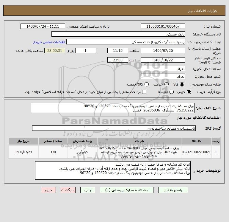 شرح کلی نیاز: ورق محافظ پشت درب ار جنس آلومینیوم رنگ سفیدابعاد 20*120 و 20*90