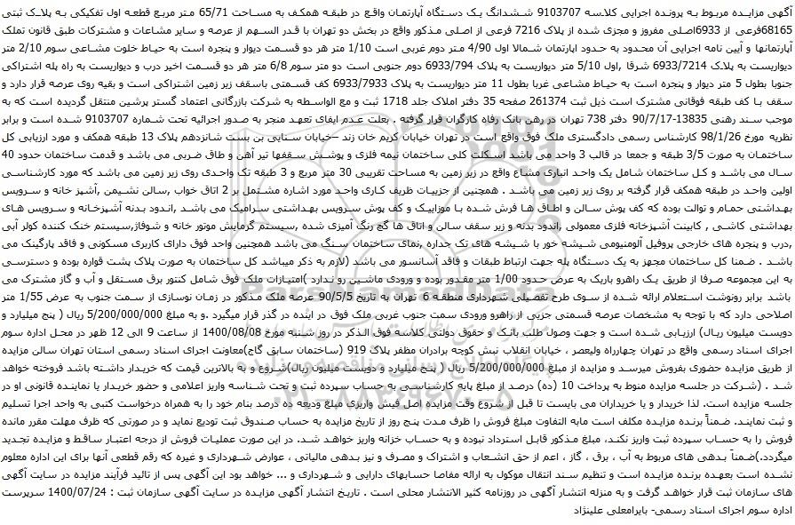 ششدانگ یک دستگاه آپارتمان واقع در طبقه همکف به مساحت 65/71 متر مربع قطعه اول تفکیکی به پلاک ثبتی 68165فرعی از 6933اصلی مفروز و مجزی شده از پلاک 7216 فرعی از اصلی مذکور واقع در بخش دو تهران با قدر السهم از عرصه و سایر مشاعات و مشترکات طبق قانون تملک آپارتمانها و آیین نامه اجرایی آن محدود به حدود اپارتمان شمالا اول 4/90 متر دوم غربی است 1/10 متر هر دو قسمت دیوار و پنجره است به حیاط خلوت مشاعی سوم 2/10 متر دیواریست به پلاک 6933/7214 شرقا ,اول 5/10 متر دیواریست به پلاک 6933/794 دوم جنوبی است دو متر سوم 6/8 متر هر دو قسمت اخیر درب و دیواریست به راه پله اشتراکی جنوبا بطول 5 متر دیوار و پنجره است به حیاط مشاعی غربا بطول 11 متر دیواریست به پلاک 6933/7933 کف قسمتی باسقف زیر زمین اشتراکی است و بقیه روی عرصه قرار دارد و سقف با کف طبقه فوقانی مشترک است ذیل ثبت 261374 صفحه 35 دفتر املاک جلد 1718 ثبت و مع الواسطه به شرکت بازرگانی اعتماد گستر پرشین منتقل گردیده است که به موجب سند رهنی 13835-90/7/17 دفتر 738 تهران در رهن بانک رفاه کارگران قرار گرفته . بعلت عدم ایفای تعهد منجر به صدور اجرائیه تحت شماره 9103707 شده است و برابر نظریه مورخ 98/1/26 کارشناس رسمی دادگستری ملک فوق واقع است در تهران خیابان کریم خان زند –خیابان سنایی بن بست شانزدهم پلاک 13 طبقه همکف و مورد ارزیابی کل ساختمان به صورت 3/5 طبقه و جمعا در قالب 3 واحد می باشد اسکلت کلی ساختمان نیمه فلزی و پوشش سقفها تیر آهن و طاق ضربی می باشد و قدمت ساختمان حدود 40 سال می باشد و کل ساختمان شامل یک واحد انباری مشاع واقع در زیر زمین به مساحت تقریبی 30 متر مربع و 3 طبقه تک واحدی روی زیر زمین می باشد که مورد کارشناسی اولین واحد در طبقه همکف قرار گرفته بر روی زیر زمین می باشد . همچنین از جزییات ظریف کاری واحد مورد اشاره مشتمل بر 2 اتاق خواب ,سالن نشیمن ,آشپز خانه و سرویس بهداشتی حمام و توالت بوده که کف پوش سالن و اطاق ها فرش شده با موزاییک و کف پوش سرویس بهداشتی سرامیک می باشد ,اندود بدنه آشپزخانه و سرویس های بهداشتی کاشی , کابینت آشپزخانه فلزی معمولی ,اندود بدنه و زیر سقف سالن و اتاق ها گچ رنگ آمیزی شده ,سیستم گرمایش موتور خانه و شوفاژ,سیستم خنک کننده کولر آبی ,درب و پنجره های خارجی پروفیل آلومنیومی شیشه خور با شیشه های تک جداره ,نمای ساختمان سنگ می باشد همچنین واحد فوق دارای کاربری مسکونی و فاقد پارگینک می باشد . ضمنا کل ساختمان مجهز به یک دستگاه پله جهت ارتباط طبقات و فاقد آسانسور می باشد (لازم به ذکر میباشد کل ساختمان به صورت پلاک پشت قواره بوده و دسترسی به این مجموعه صرفا از طریق یک راهرو باریک به عرض حدود 1/00 متر مقدور بوده و ورودی ماشین رو ندارد )امتیازات ملک فوق شامل کنتور برق مستقل و آب و گاز مشترک می باشد برابر رونوشت استعلام ارائه شده از سوی طرح تفصیلی شهرداری منطقه 6 تهران به تاریخ 90/5/5 عرصه ملک مذکور در زمان نوسازی از سمت جنوب به عرض 1/55 متر اصلاحی دارد که با توجه به مشخصات عرصه قسمتی جزیی از راهرو ورودی سمت جنوب غربی ملک فوق در اینده در گذر قرار میگیرد .و به مبلغ 5/200/000/000 ریال ( پنج میلیارد و دویست میلیون ریال) ارزیابی شده است و جهت وصول طلب بانک و حقوق دولتی کلاسه فوق الذکر در روز شنبه مورخ 1400/08/08 از ساعت 9 الی 12 ظهر در محل اداره سوم اجرای اسناد رسمی واقع در تهران چهارراه ولیعصر ، خیابان انقلاب نبش کوچه برادران مظفر پلاک 919 (ساختمان سابق گاج)معاونت اجرای اسناد رسمی استان تهران سالن مزایده از طریق مزایده حضوری بفروش میرسد و مزایده از مبلغ 5/200/000/000 ریال ( پنج میلیارد و دویست میلیون ریال)شروع و به بالاترین قیمت که خریدار داشته باشد فروخته خواهد شد . (شرکت در جلسه مزایده منوط به پرداخت 10 (ده) درصد از مبلغ پایه کارشناسی به حساب سپرده ثبت و تحت شناسه واریز اعلامی و حضور خریدار یا نماینده قانونی او در جلسه مزایده است. لذا خریدار و یا خریداران می بایست تا قبل از شروع وقت مزایده اصل فیش واریزی مبلغ ودیعه ده درصد بنام خود را به همراه د