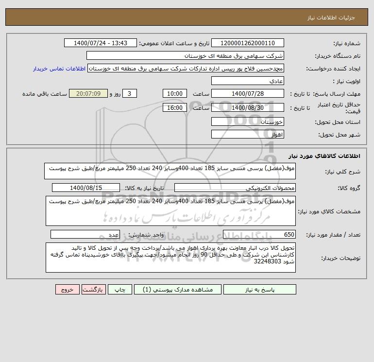 نام دستگاه خریدار:شرکت سهامی برق منطقه ای خوزستان