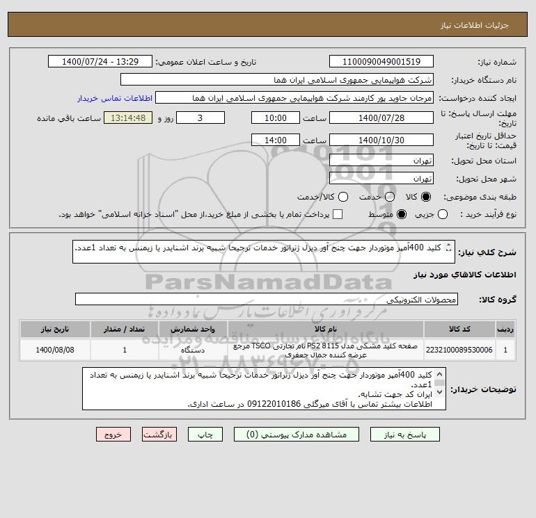 نام دستگاه خریدار:شرکت هواپیمایی جمهوری اسلامی ایران هما