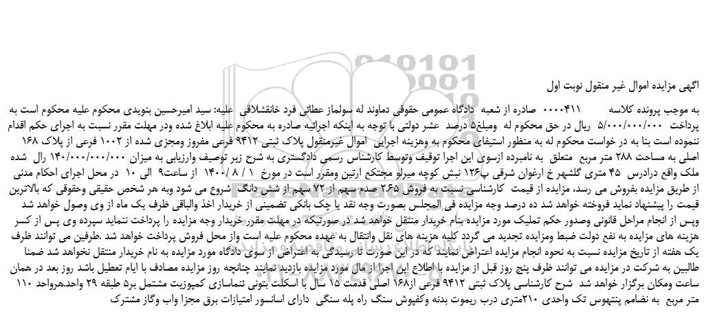 به موجب پرونده کلاسه        0000411  صادره از شعبه  دادگاه عمومی حقوقی دماوند له سولماز عطائی فرد خانقشلاقی  علیه: سید امیرحسین بنویدی محکوم علیه محکوم است به پرداخت  5/000/000/000  ریال در حق محکوم له  ومبلغ5 درصد  عشر دولتی با توجه به اینکه اجرائیه صادره به محکوم علیه ابلاغ شده ودر مهلت مقرر نسبت به اجرای حکم اقدام ننموده است بنا به در خواست محکوم له به منظور استیفای محکوم به وهزینه اجرایی  اموال غیرمنقول پلاک ثبتی 9412 فرعی مفروز ومجزی شده از 1002 فرعی از پلاک 168 اصلی به مساحت 288 متر مربع  متعلق  به نامبرده ازسوی این اجرا توقیف وتوسط کارشناس رسمی دادگستری به شرح زیر توصیف وارزیابی به میزان 140/000/000/000 رال  شده  ملک واقع درادرس  45 متری گلشهر خ ارغوان شرقی پ126 نبش کوچه میرلو مجتکع ارتین ومقرر است در مورخ  1 / 8 /1400  از ساعت9  الی 10  در محل اجرای احکام مدنی از طریق مزایده بفروش می رسد، مزایده از قیمت  کارشناسی نسبت به فروش 2.65 صدم سهم از 72 سهم از شش دانگ  شروع می شود وبه هر شخص حقیقی وحقوقی که بالاترین قیمت را پیشنهاد نماید فروخته خواهد شد ده درصد وجه مزایده فی المجلس بصورت وجه نقد یا چک بانکی تضمینی از خریدار اخذ والباقی ظرف یک ماه از وی وصول خواهد شد وپس از انجام مراحل قانونی وصدور حکم تملیک مورد مزایده بنام خریدار منتقل خواهد شد در صورتیکه در مهلت مقرر خریدار وجه مزایده را پرداخت ننماید سپرده وی پس از کسر هزینه های مزایده به نفع دولت ضبط ومزایده تجدید می گردد کلیه هزینه های نقل وانتقال به عهده محکوم علیه است واز محل فروش پرداخت خواهد شد .طرفین می توانند ظرف یک هفته از تاریخ مزایده نسبت به نحوه انجام مزایده اعتراض نمایند که در این صورت تا رسیدگی به اعتراض از سوی دادگاه مورد مزایده به نام خریدار منتقل نخواهد شد ضمنا طالبین به شرکت در مزایده می توانند ظرف پنج روز قبل از مزایده با اطلاع این اجرا از مال مورد مزایده بازدید نمایند چنانچه روز مزایده مصادف با ایام تعطیل باشد روز بعد در همان ساعت ومکان برگزار خواهد شد  شرح کارشناسی پلاک ثبتی 9412 فرعی از168 اصلی قدمت 15 سال با اسکلت بتونی ئنماسازی کمپوزیت مشتمل بر5 طبقه 29 واحد.هرواحد 110 متر مربع  به نضامم پنتهوس تک واحدی 210متری درب ریموت بدنه وکفپوش سنگ راه پله سنگی  دارای اسانسور امتیازات برق مجزا واب وگاز مشترک