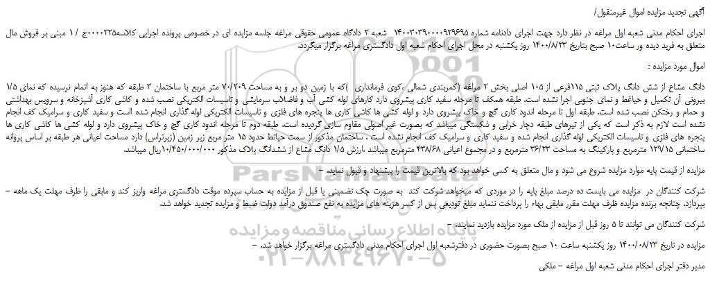 - مزایده در تاریخ 1400/08/23 روز یکشنبه ساعت 10 صبح بصورت حضوری در دفترشعبه اول اجرای احکام مدنی دادگستری مراغه برگزار خواهد شد.