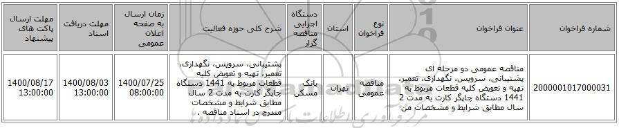 2000001017000031 | مناقصه عمومی دو مرحله ای پشتیبانی، سرویس، نگهداری، تعمیر، تهیه و تعویض کلیه قطعات مربوط به 1441 دستگاه چاپگر کارت به مدت 2 سال مطابق شرایط و مشخصات من | مناقصه عمومی | تهران | بانک مسکن | پشتیبانی، سرویس، نگهداری، تعمیر، تهیه و تعویض کلیه قطعات مربوط به 1441 دستگاه چاپگر کارت به مدت 2 سال مطابق شرایط و مشخصات مندرج در اسناد مناقصه . | 1400/07/25 08:00:00 | 1400/08/03 13:00:00 | 1400/08/17 13:00:00 |