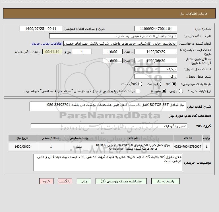 شرح کلی نیاز: نیاز شامل ROTOR SET کامل یک ست کامل طبق مشخصات پیوست می باشد 33492701-086