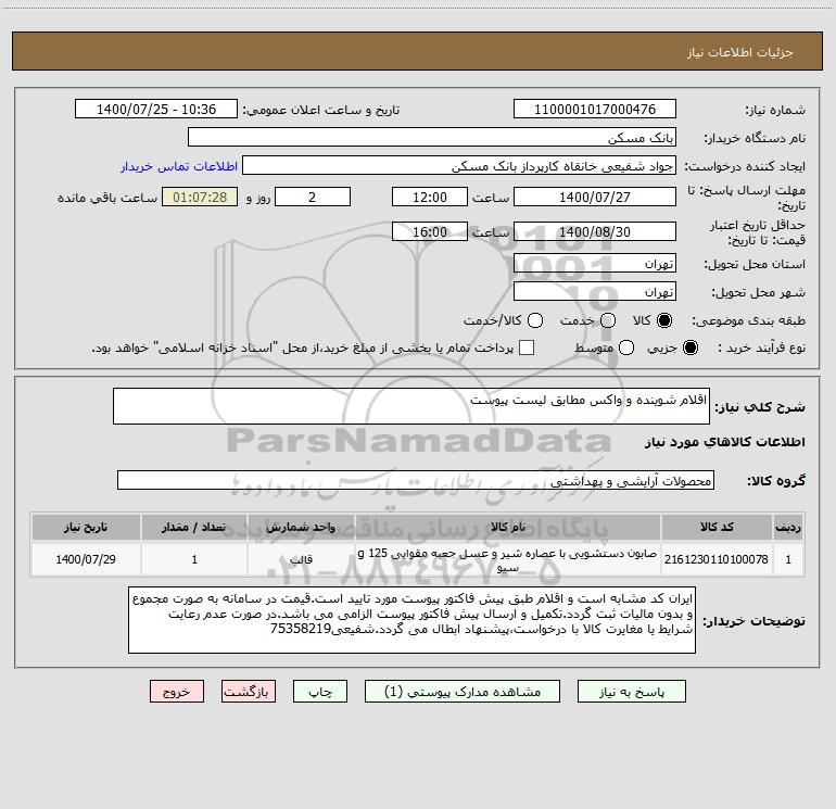 شرح کلی نیاز: اقلام شوینده و واکس مطابق لیست پیوست