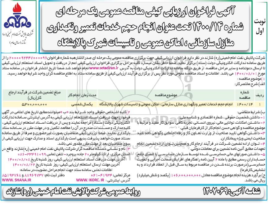 آگهی ارزیابی کیفی مناقصه عمومی یک مرحله ای شماره 1400/14 تحت عنوان انجام حجم خدمات تعمیر و نگهداری منازل سازمانی، اماکن عمومی و تاسیسات شهرک پالایشگاه