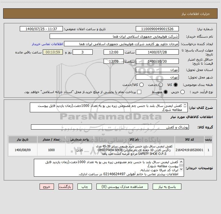 توضیحات خریدار:کفش ایمنی ساق بلند با جنس چم مصنوعی زیره پی یو به تعداد 1000جفت.(زمان بازدید فایل پیوست مطالعه شود). ایران کد صرفا جهت تشابه. اطلاعات بیشتر تماس با خانم آهوئی 02146624497 در ساعت اداری. نحوه پرداخت مالی 4 ماهه اداری.