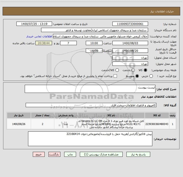 نام دستگاه خریدار: سازمان صدا و سیمای جمهوری اسلامی ایران(معاونت توسعه و فناور
